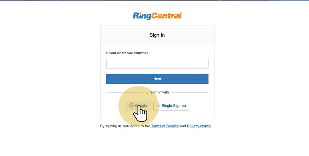 3. A new browser tab opens to the RingCentral sign-in page. Select Google to continue.