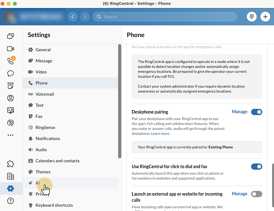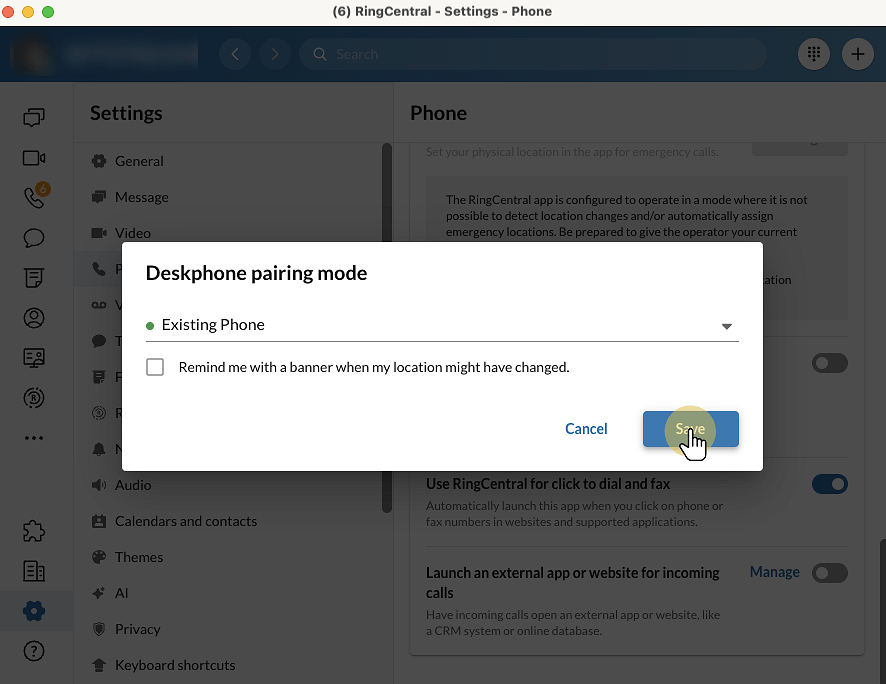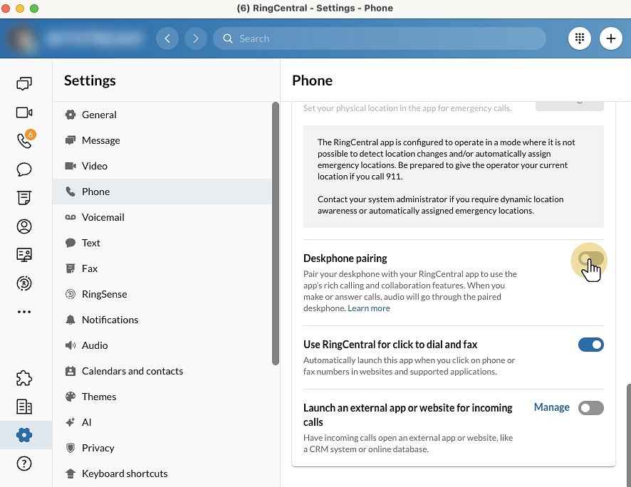 This setting connects your desk phone with the RingCentral app. You will be able to use the app’s calling and collaboration features, with audio routed through the paired desk phone when you make or receive calls.