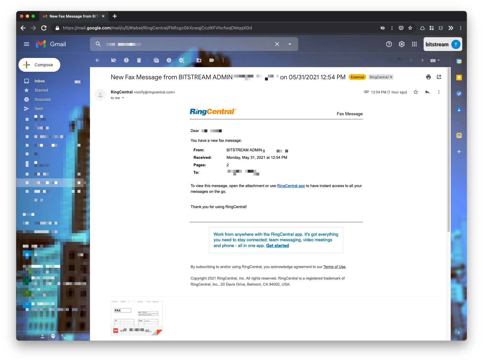 Received faxes will be sent from RingCentral to your email inbox as an attachment