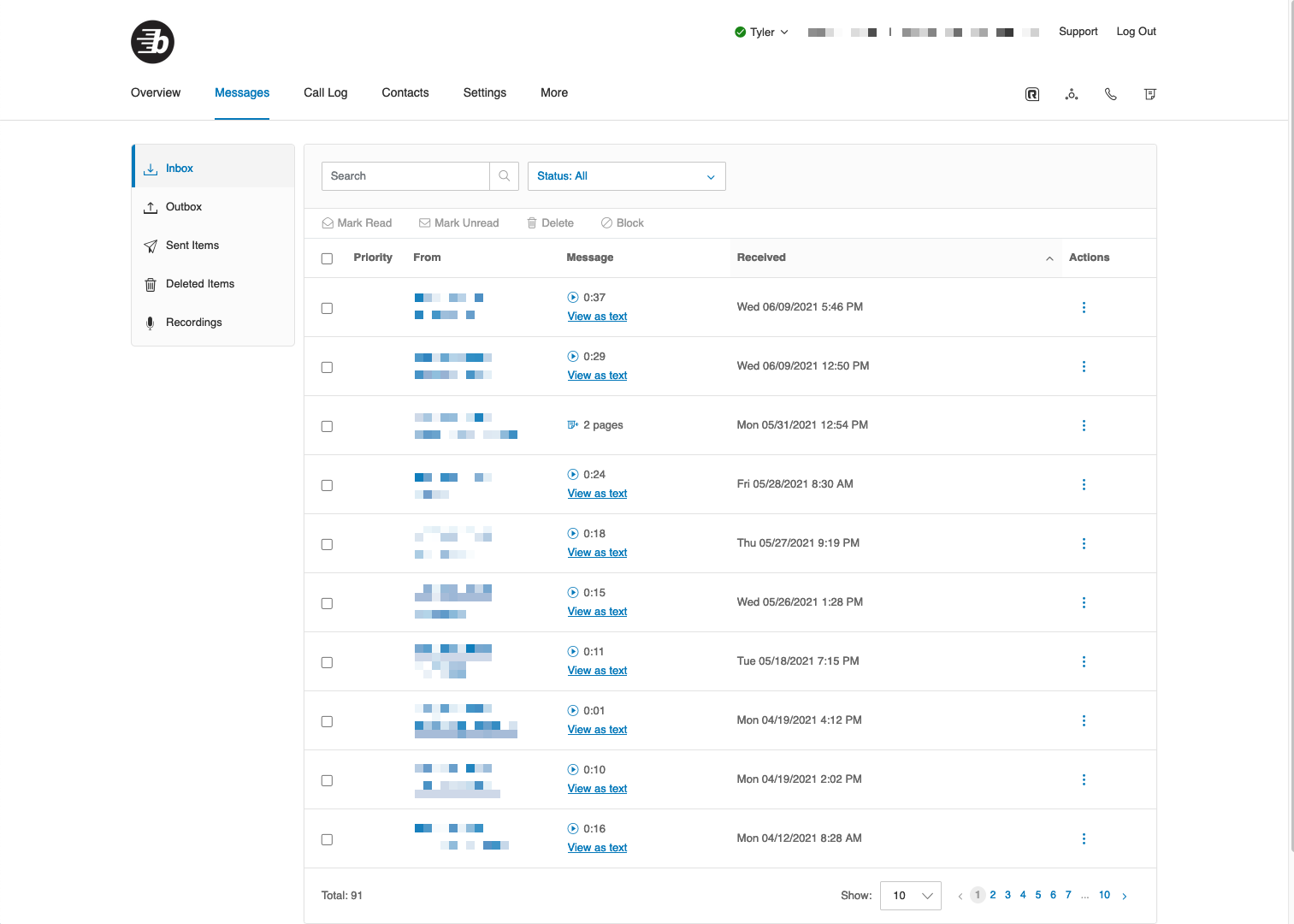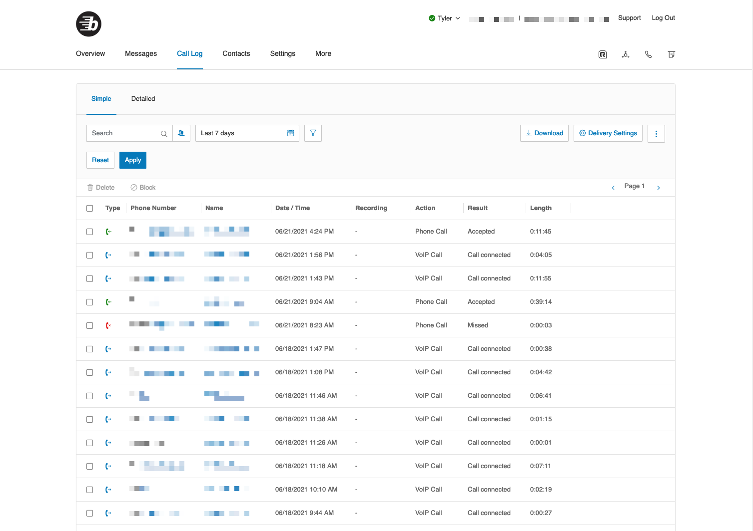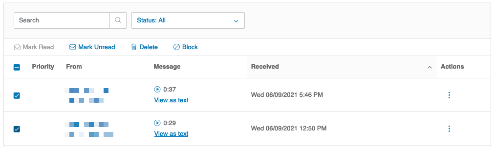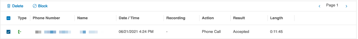 As with messages, you may select a call, and apply the actions Delete or Block Number. If recording is enabled for your extension, you may play an available recording by selecting the Play icon.