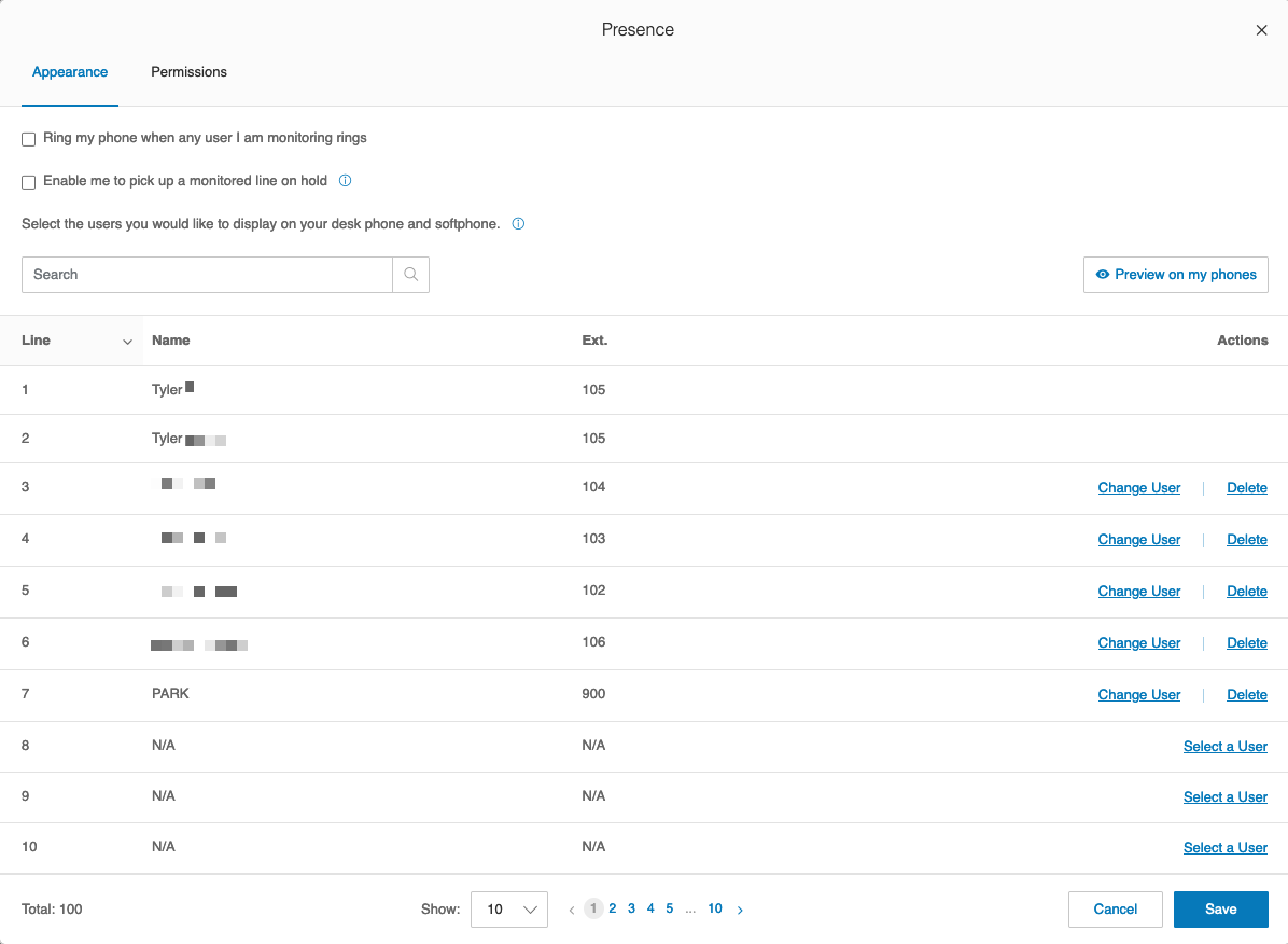 Presence settings manage the "lines" that are displayed on your desk phone. The first two lines will always display your name; the remaining lines may be assigned to other extensions in your organization.