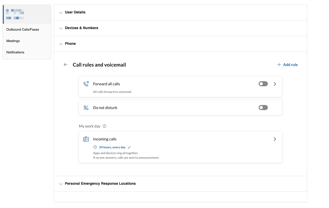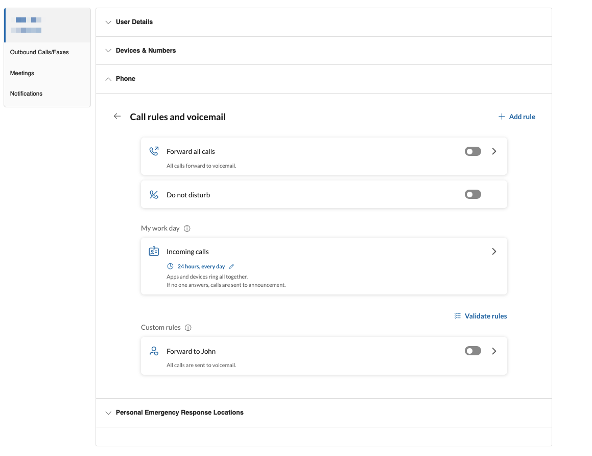 You can activate and deactivate forwarding rules and your DND status from Call rules and voicemail section.