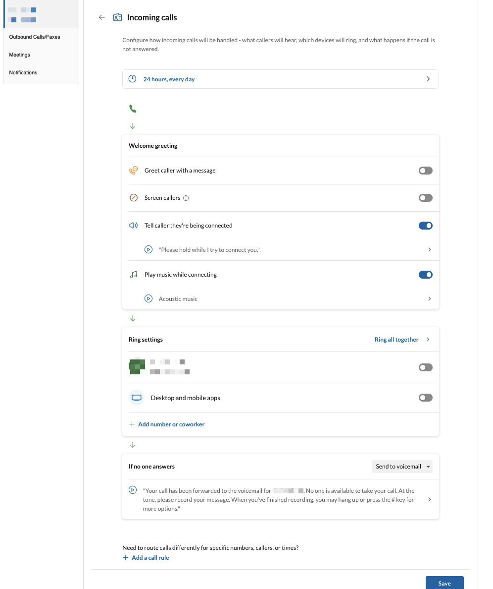 This section controls how calls flow when your extension or direct number is called.