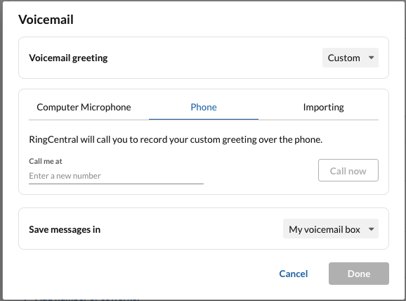 2. Enter your phone number, then select Call Now. You will receive an automated call, where you can record a new voicemail greeting.
