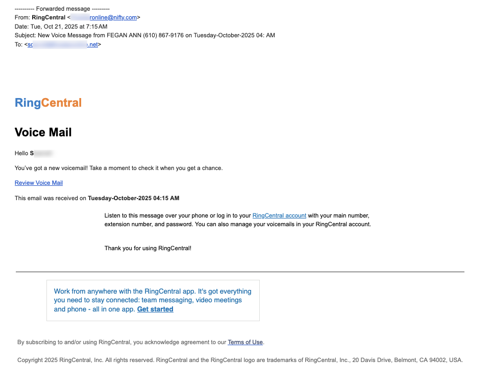 We’ve seen a new phishing email pretending to be a RingCentral voicemail notification. It looks similar to a real voicemail alert but is actually designed to steal your login credentials.
